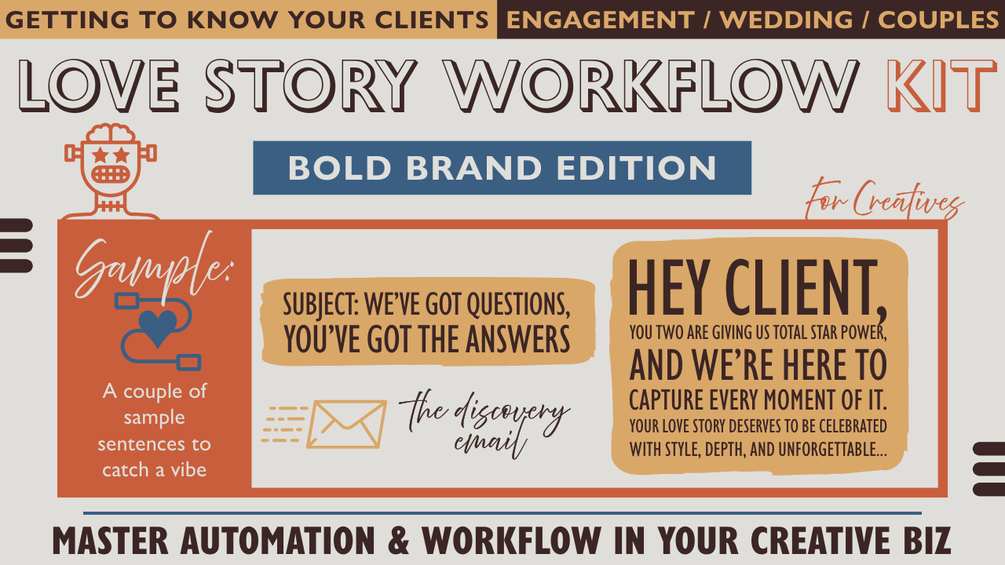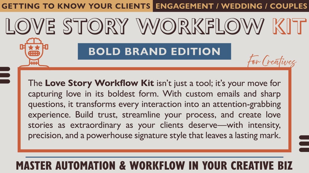 This isn’t just another set of templates. This is your toolkit for pulling out all the stops, shaping unforgettable narratives, and shooting like every story deserves its own standing ovation. Every email, every question, every follow-up brims with dramatic intensity, dripping with intention and built to match your bold, fearless approach. For those who frame love with striking clarity, the Love Story Workflow Kit is a game-changer.